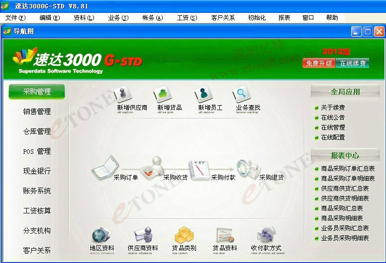 采購訂貨管理:超期未收貨提醒、中止訂貨 采購收貨管理:現款采購、賒購管理、贈品管理、多計量單位管理、自動生成財務憑證 采購退貨管理:現款退貨、退貨款沖抵應付款、自動生成財務憑證 暫估入庫管理:貨到票未到入庫、暫估入庫貨品退貨 采購費用分攤:現款支付采購費用、采購費用賒賬、費用發生即計成本 地區資料管理、供應商資料管理、?跗防啾鴯芾? 貨品資料管理、收付款方式管理 核心報表 采購訂單匯總表、采購訂單明細表、采購開單匯總表、采購開單明細表 采購費用分攤匯總表、采購費用分攤明細表、采購商品折扣匯總表 采購商品折扣明細表、估價入庫匯總表、估價入庫明細表 商品采購明細表、業務員采購匯總表、業務員采購明細表
