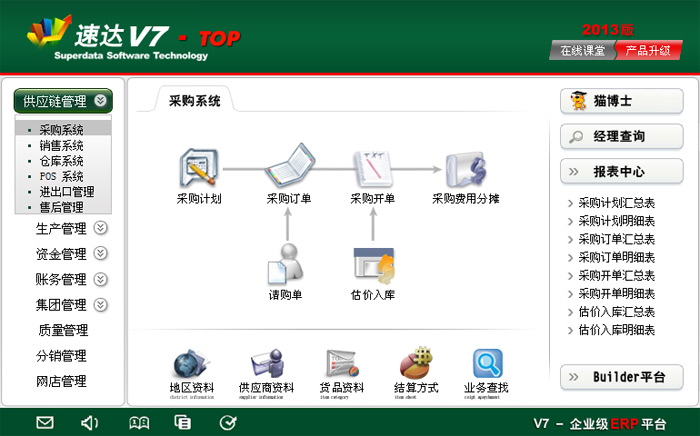 應收分析報表、應付分析報表、配送報表、開票管理報表、POS銷售報表、售后報表、客戶關系報表。
